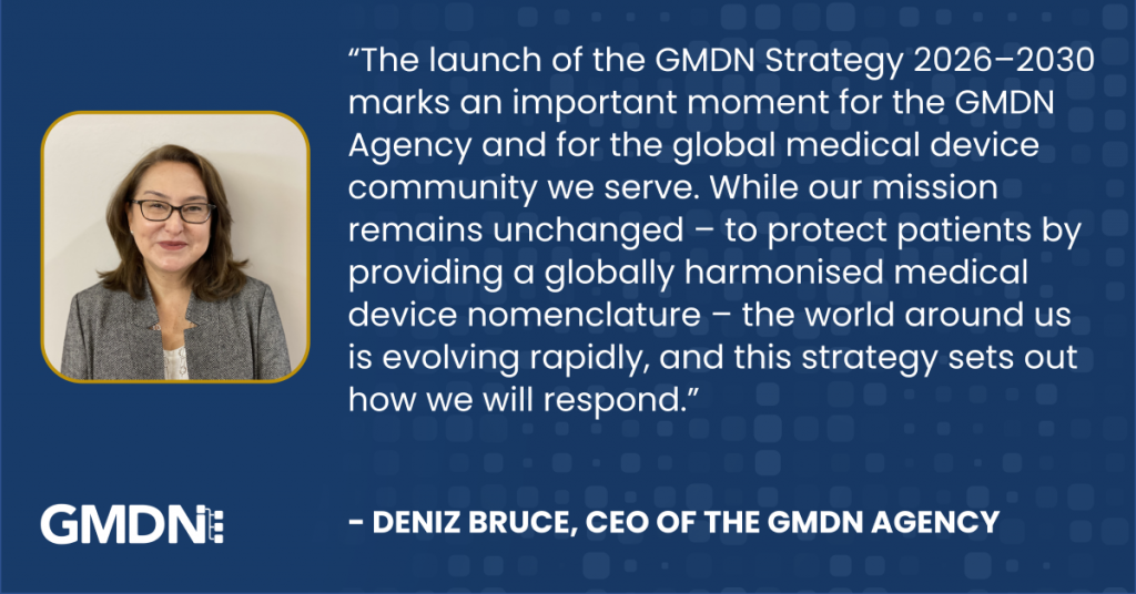 The launch of the GMDN Strategy 2026–2030 marks an important moment for the GMDN Agency and for the global medical device community we serve. While our mission remains unchanged – to protect patients by providing a globally harmonised medical device nomenclature – the world around us is evolving rapidly, and this strategy sets out how we will respond.